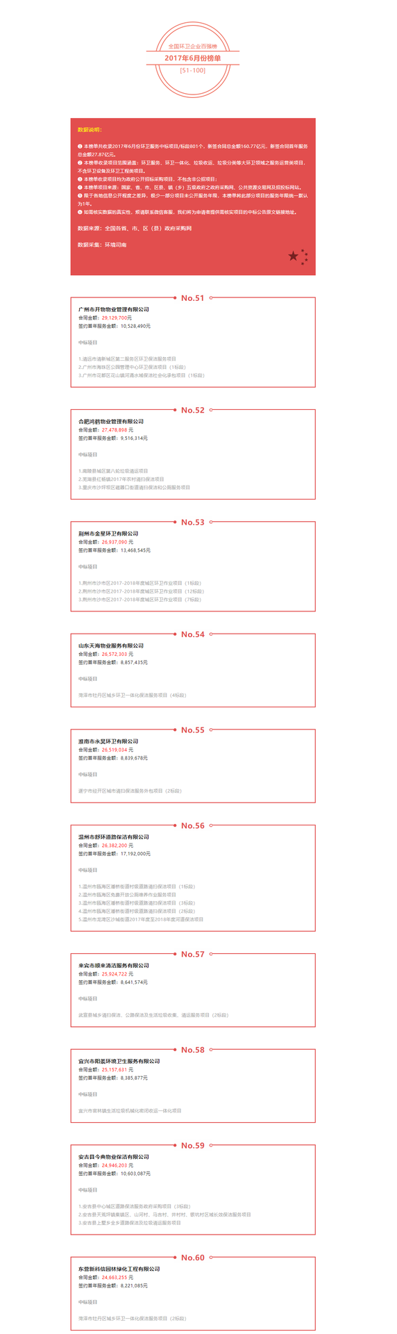 全國環衛服務行業2017年6月份業績TOP100(51-100