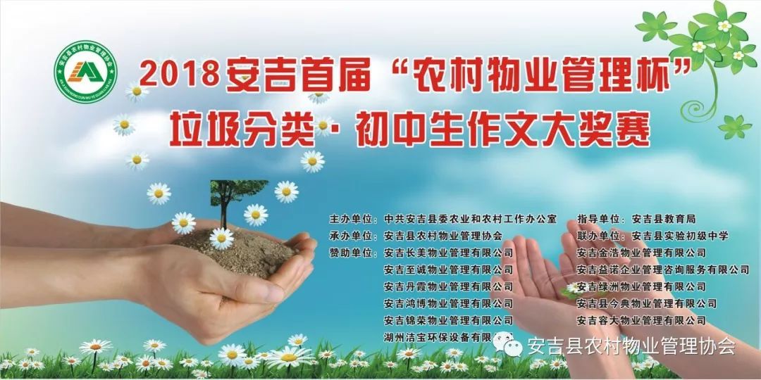 為此,安吉縣農辦、安吉縣教育局聯合舉辦了本次以初中生為主的垃圾分類作文大獎賽,旨在把垃圾分類工作普及到我縣的千家萬戶,共同來呵護青山綠水。